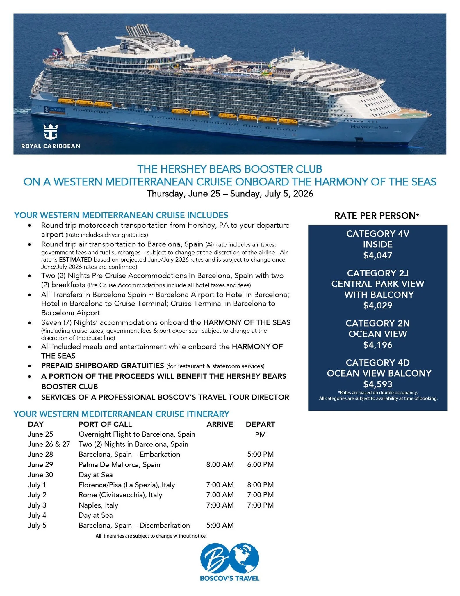 If you are interested in hearing more about this awesome trip to the Western Mediterranean, please join Boscov’s Travel for a presentation on Tuesday October 21, 2025 at 6:00pm. This presentation will take place at the Hershey Italian Lodge. Please contact your local Boscov’s Travel to reserve your spot.