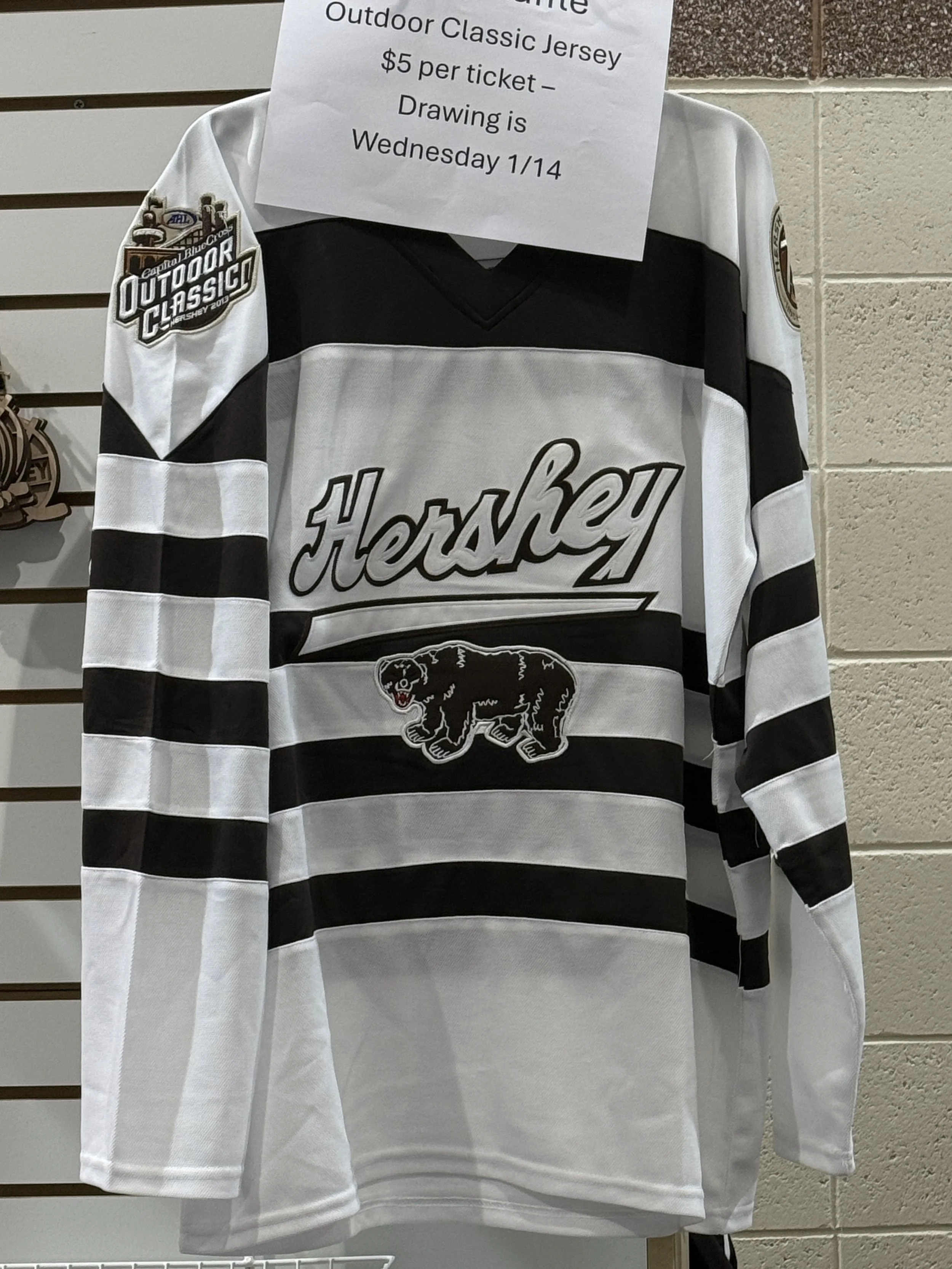 Tonight ONLY 1/14/2026 we are raffling off an Outdoor Classic Jersey to help the Hershey Jr Bears Quebec Team. You do not need to be present to win. Drawing will be held 1/14/2026 at the drop of the puck of the 2nd period. Cost per ticket is $5.00 each/Small Games of Chance License #216.