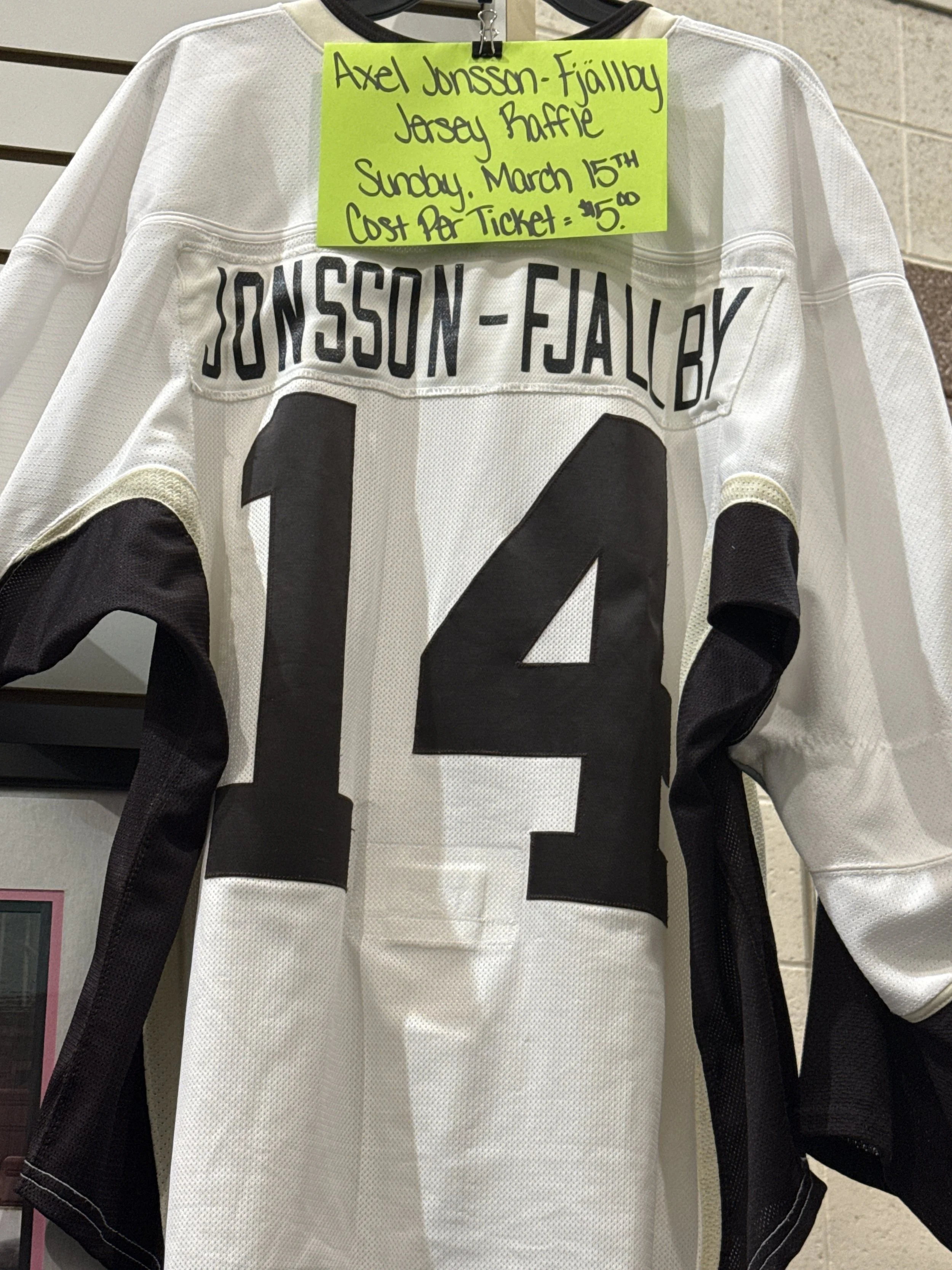 Coming 3/14 and 3/15 we are raffling off an Alel Jonsson-Fjallby jersey. You do not need to be present to win. Drawing will be held 3/3 at the drop of the puck of the 2nd period. Cost per ticket is $5.00 each/Small Games of Chance License #216.